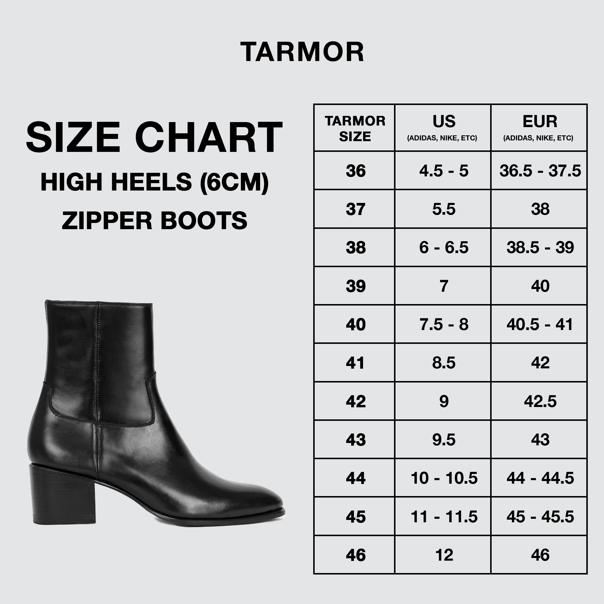The size chart is for reference only. For more accurate sizing advice, please message TARMOR on Facebook or Instagram.